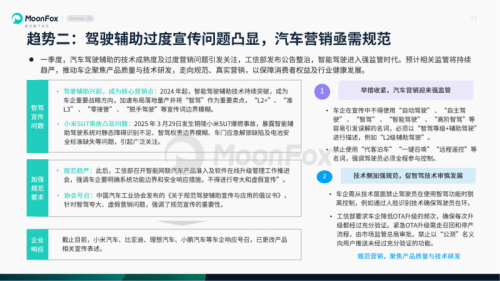 趋势二:驾驶辅助过度宣传问题凸显,分析政策监管、汽车消费、同时列举头部企业案例进行分析。汽车营销亟需规范